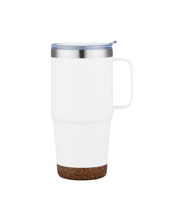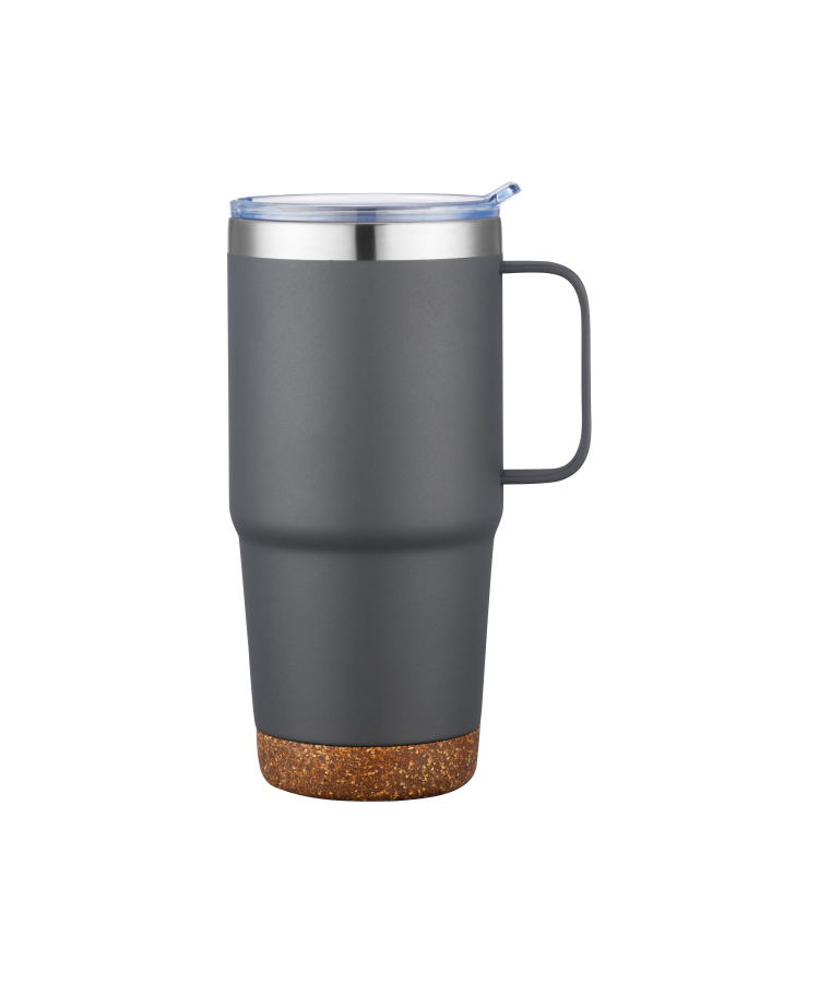- Stay refreshed on the go with our 24oz Travel Mug with Cork Bottom! Made from durable 18/8 stainless steel with a copper coating, this mug features vacuum insulation to keep your beverages hot or cold longer.