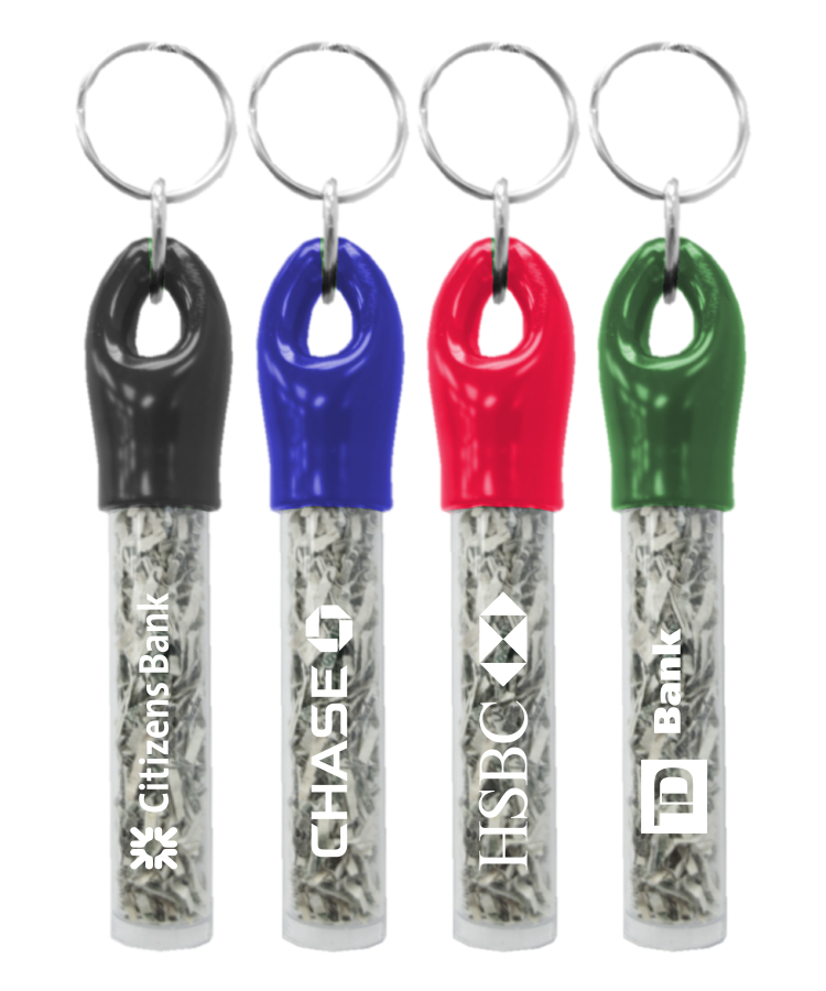 Recycled Cylinder Shaped Key Chain - Filled with Shredded Genuine Currency